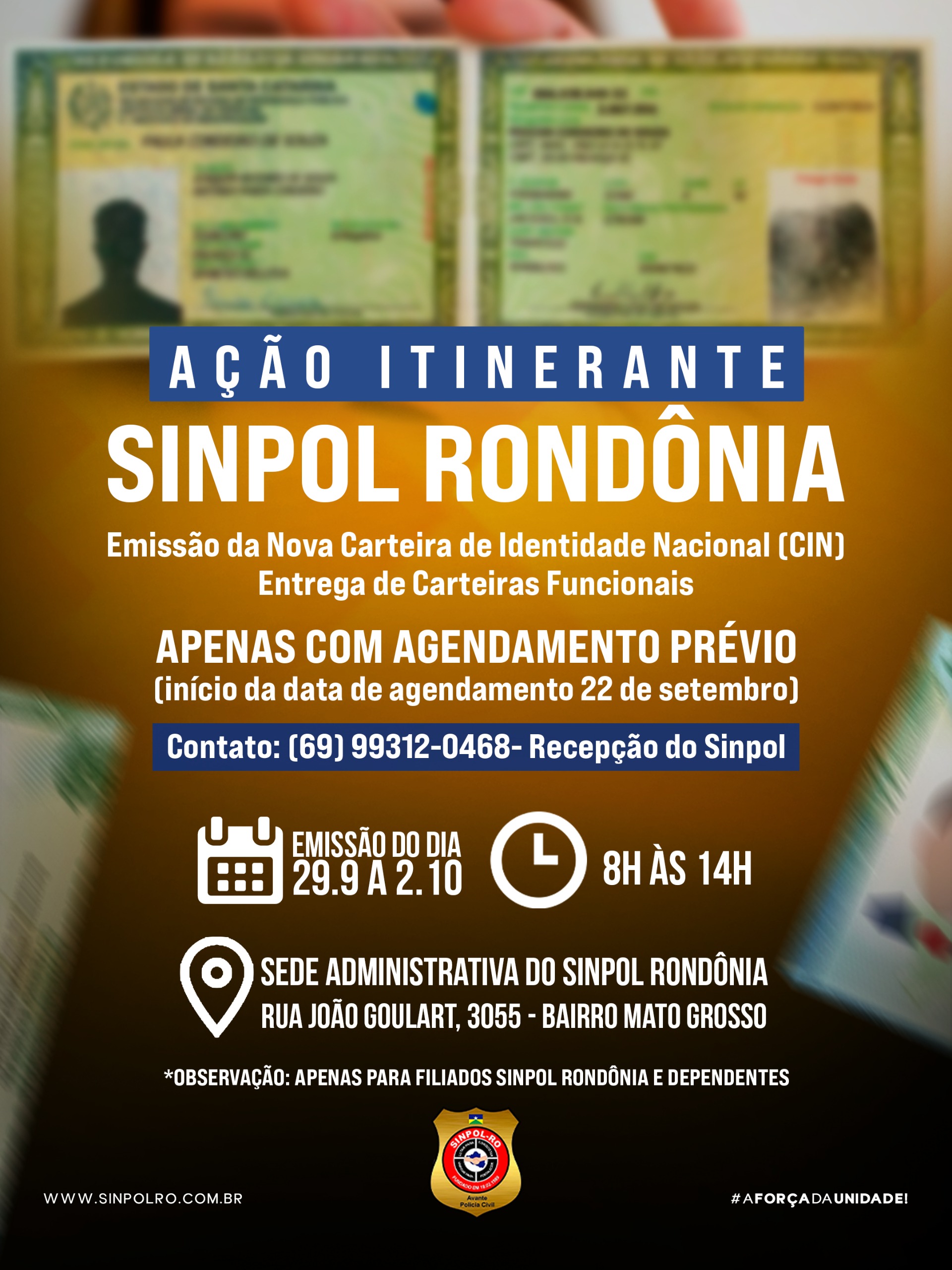 O Sindicato dos Policiais Civis de Rondônia (Sinpol Rondônia) vai promover uma ação itinerante voltada aos profissionais da categoria, oferecendo emissão da Nova Carteira de Identidade Nacional (CIN) e entrega das carteiras funcionais já solicitadas anteriormente. A ação acontecerá na sede administrativa do Sinpol Rondônia, no período de 29 de setembro a 2 de outubro, das 8h às 14h.
