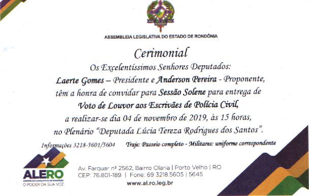 A diretoria do Sindicato do Servidores da Polícia Civil do Estado de Rondônia – SINSEPOL, convida à todos os escrivães de Polícia que integram os quadros da briosa Polícia Civil de Rondônia, a participarem do Cerimonial organizado pelo Sindicato dos Escrivães de Polícia de Rondônia - SEPRO, com o apoio da Assembleia Legislativa.
