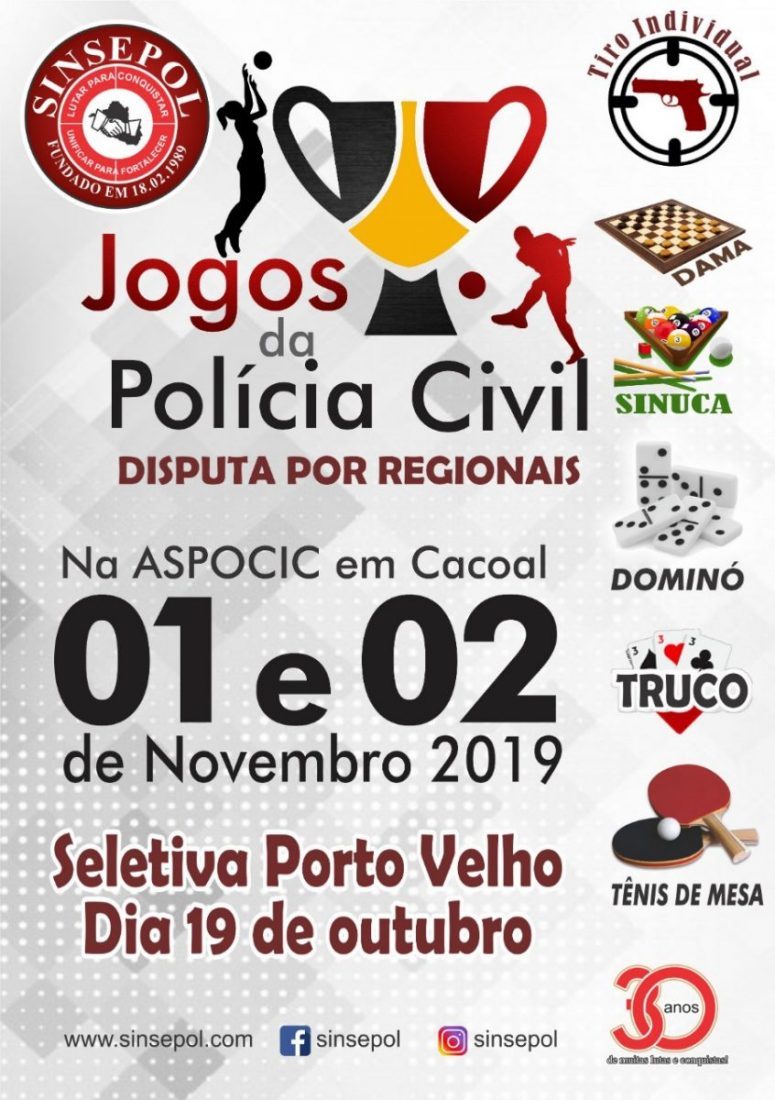 O Sindicato dos Servidores da Polícia Civil do Estado de Rondônia – SINSEPOL, através da sua Diretoria de Esporte e Lazer, tem a honra de informar a todos os seus filiados que, os jogos da Polícia Civil serão realizados na ASPOCIC em Cacoal nos dias 01 e 02 de novembro deste ano.