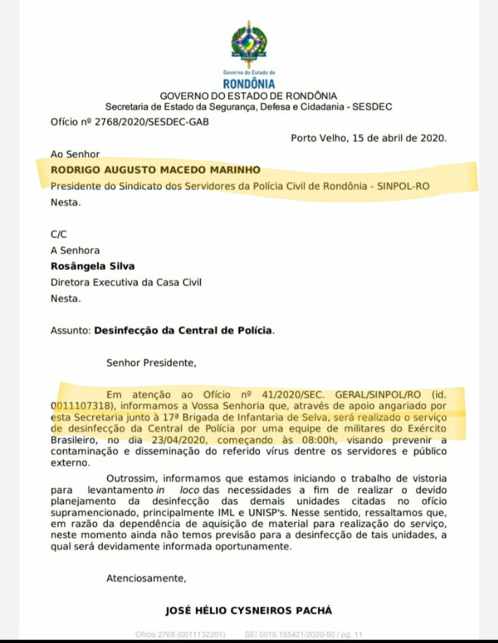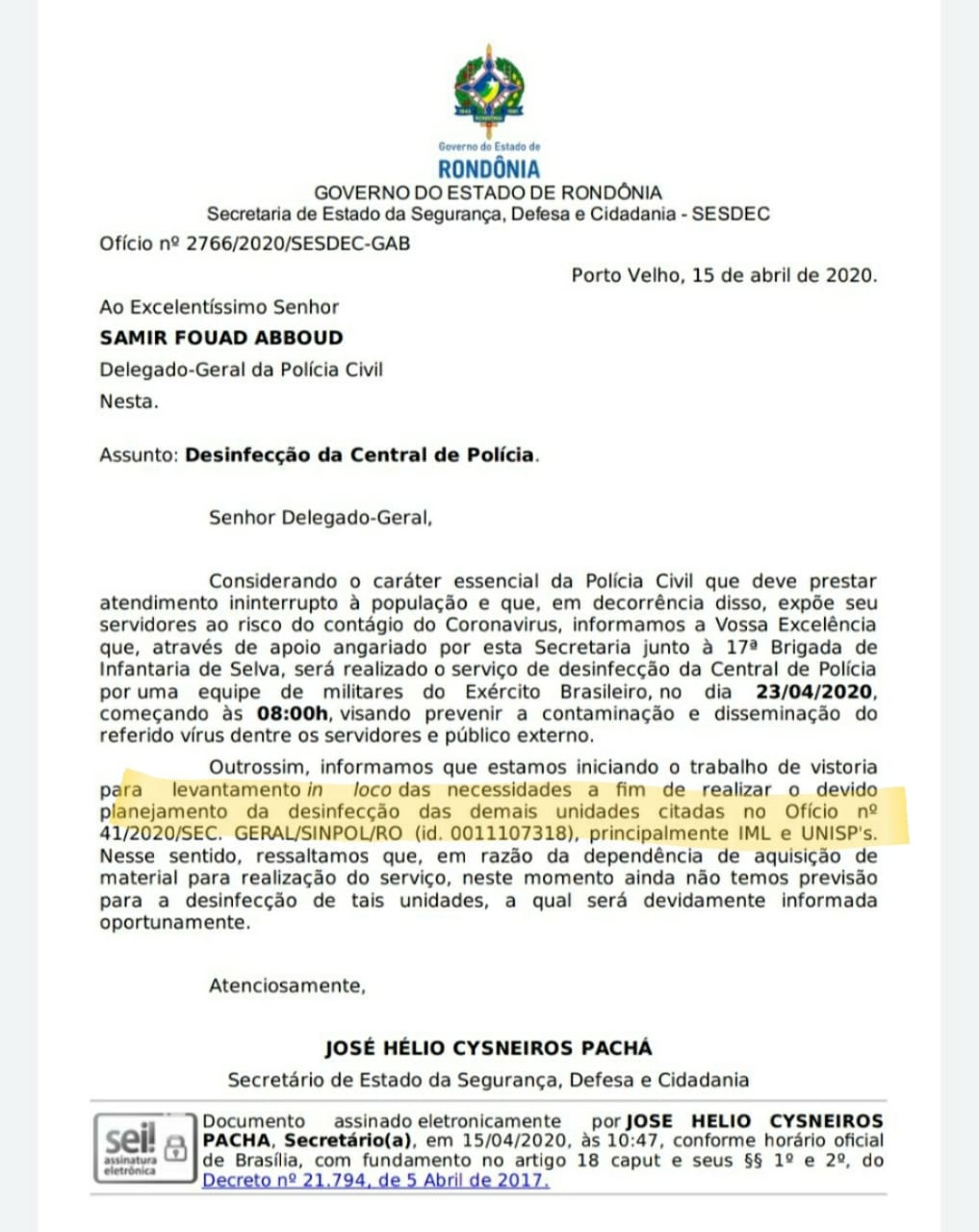 O expediente fora despachado, o Secretário da SESDEC Coronel José Hélio Cysneiros Pachá solicitou apoio do Comandante da 17ª Brigada de Infantaria de Selva – Exército Brasileiro, fornecendo os insumos necessários para a execução dos trabalhos pela SESDEC. Desta forma, está sendo realizado Cronograma para atender as unidades policias, a Central de Polícia, deverá ocorrer no dia 23/04/2020.