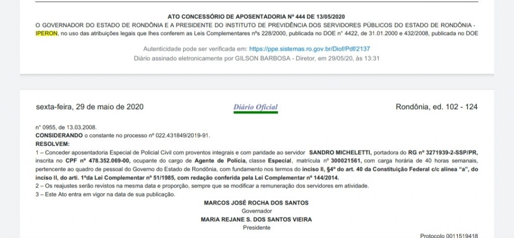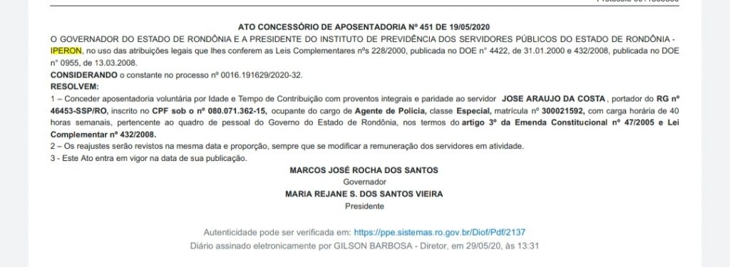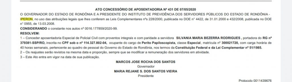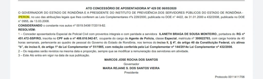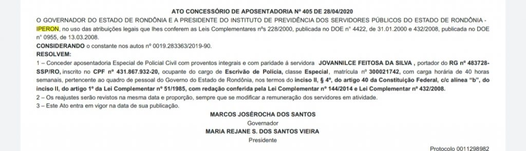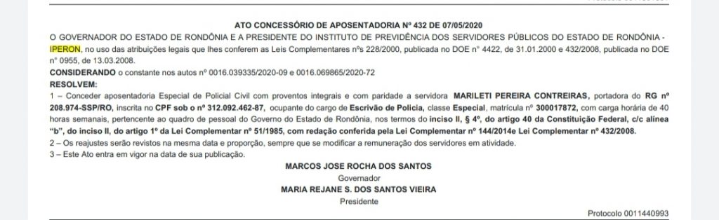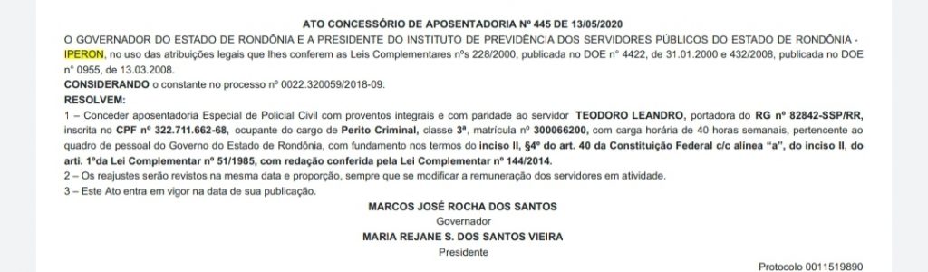 A diretoria do Sindicato dos Servidores da Polícia Civil de Rondônia (SIINPOL-RO), informa a publicação no Diário Oficial do Governo de Rondônia, dos nomes de policiais civis que receberam o benefício da aposentadoria especial com salário integral e com PARIDADE, após relevantes serviços prestados à Segurança Pública e ao Estado de Rondônia.