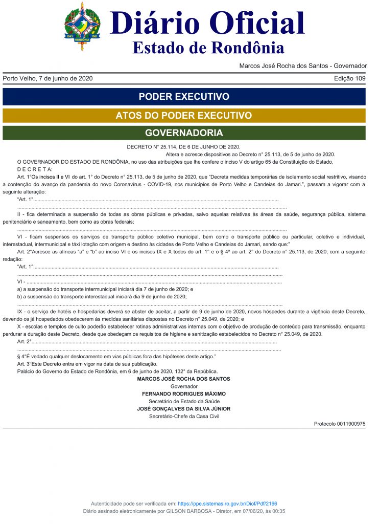 (decreto 25.113), que ampliava as medidas de restrição em Porto Velho e Candeias por conta do Coronavírus. Uma das alterações garante a realização de obras federais nas duas cidades no período mais restritivo das novas medidas, que seguem até o próximo domingo (14). Ele também proibiu o transporte intermunicipal e interestadual para Porto Velho e Candeias. No primeiro caso a partir desde domingo e no outro, a partir da terça-feira (9). Hospedagens em hotéis também foram vedadas. Uma outra alteração assegurou o serviço interno de igrejas com vista a transmissões de cultos. A última medida adotada pelo governador veda o deslocamento de empregados de empresas e servidores nas vias públicas dessas cidades até o próximo domingo, com exceção daqueles imprescindíveis para serviços essenciais ou atividades autorizadas a funcionar. Mesmo com todas essas proibições, o governante ainda insiste em afirmar que não se trata de imposição de "lockdown" nas duas cidades.