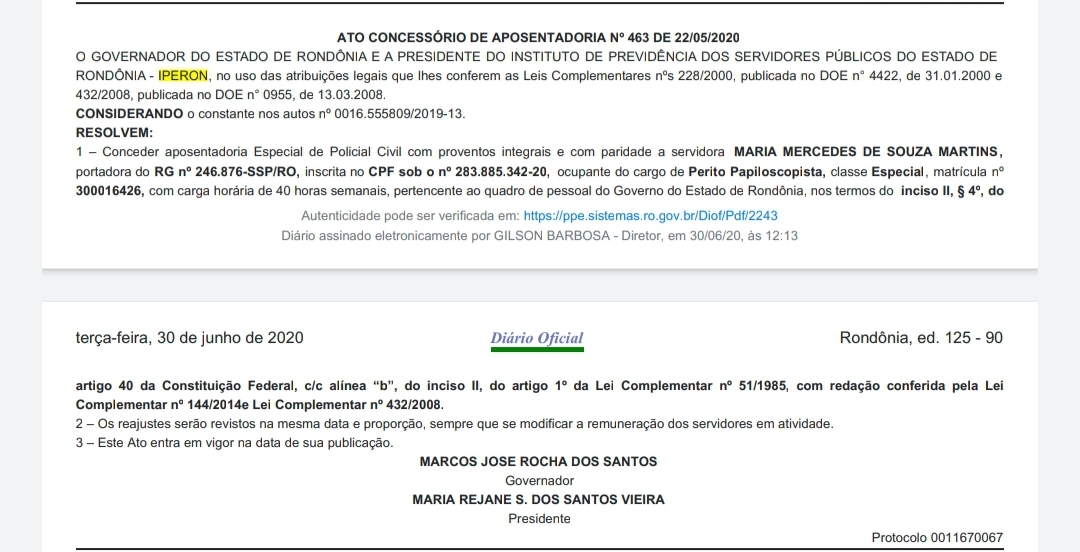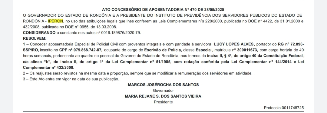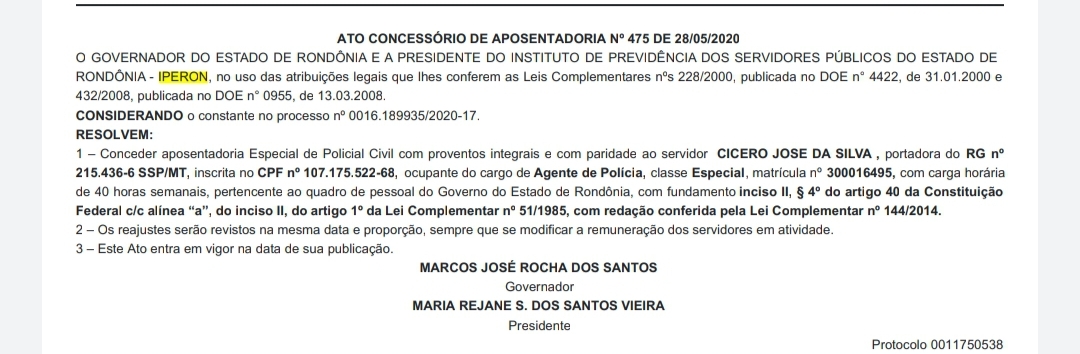 A diretoria do Sindicato dos Servidores da Polícia Civil de Rondônia (SIINPOL-RO), informa a publicação no Diário Oficial do Governo de Rondônia, dos nomes de policiais civis que receberam o benefício da aposentadoria especial com salário integral e com PARIDADE, após relevantes serviços prestados à Segurança Pública e ao Estado de Rondônia.