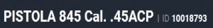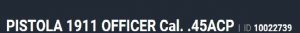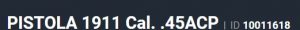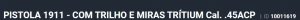 Especificação Armas de Fogo Tipo Funcionamento Arma SEMI-AUTOMATICA Quantidade Raias Arma 6 Sentido Raia Arma ESQUERDA Tipo Alma da Arma RAIADA Calibre da Arma 45 ACP Tipo Acabamento Arma CARBONO FOSCO Quantidade Canos Arma 1 Tamanho do Cano Arma 128mm Número de Tiros Arma 8 Espécie da Arma PISTOLA Marca da Arma TAURUS Armas de Fogo Taurus Tipo de Ação SA - AÇÃO SIMPLES Tipo de Carregador MONOFILAR Tipo de Mira N3 - MIRA NOVAK 3 PONTOS BRANC Sistema de Segurança TRAVA DO PUNHO Quantidade de Carregadores 3 Altura (mm) 148 Altura (pol) 5,8 Largura (mm) 38 Largura (pol) 1,5 Comprimento Cano (pol) 5 Comprimento Total (mm) 221 Comprimento Total (pol) 8,7 Peso Arma (g) 1130 Peso Arma (Kg) 1,130 Registrado no EB ReTEx nº 2122/06 Modelo 1911 Nome Comercial PISTOLA 1911 _________________________________________________________________________________________