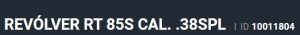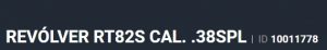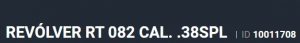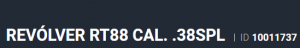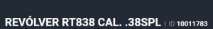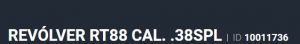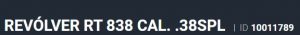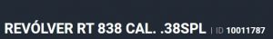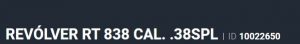 Especificação Armas de Fogo Tipo Funcionamento Arma REPETICAO Quantidade Raias Arma 6 Sentido Raia Arma DIREITA Tipo Alma da Arma RAIADA Calibre da Arma .38 SPL Tipo Acabamento Arma INOX ALTO BRILHO Quantidade Canos Arma 1 Tamanho do Cano Arma 101mm Número de Tiros Arma 8 Espécie da Arma REVOLVER Marca da Arma TAURUS Armas de Fogo Taurus Localização FLORIDA Registrado no EB ReTEx nº 1565/96-S1 Modelo 388165-PEISLI/CP Nome Comercial REVOLVER RT838 TAURUS - NUMERAÇÃO DE SÉRIE Revólveres Outras Armações 6 tiros, Compacta, 446, Casull _________________________________________________________________________________________