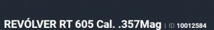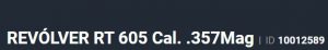 Especificação Armas de Fogo Tipo Funcionamento Arma REPETICAO Quantidade Raias Arma 6 Sentido Raia Arma DIREITA Tipo Alma da Arma RAIADA Calibre da Arma 357 Mag Tipo Acabamento Arma CARBONO FOSCO Quantidade Canos Arma 1 Tamanho do Cano Arma 51mm Número de Tiros Arma 5 Espécie da Arma REVOLVER Marca da Arma TAURUS Controle do Exercito Brasileiro Mercado N/A Armas de Fogo Taurus Tipo de Ação SA/DA - DUPLA AÇÃO Tipo de Mira MP - MIRA PADRÃO Sistema de Segurança BARRA DE PERCUSSÃO Altura (mm) 116 Altura (pol) 4,57 Largura (mm) 35 Largura (pol) 1,36 Comprimento Cano (pol) 2,02 Comprimento Total (mm) 169 Comprimento Total (pol) 6,65 Peso Arma (g) 618 Peso Arma (Kg) 0,618 Registrado no EB ReTEx nº 1500/94-S3 Modelo RT605 Nome Comercial REVOLVER RT605 TAURUS - NUMERAÇÃO DE SÉRIE Revólveres 5Tiros Armação 5 tiros _________________________________________________________________________________________