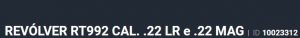 Especificação Armas de Fogo Tipo Funcionamento Arma REPETICAO Quantidade Raias Arma 6 Sentido Raia Arma DIREITA Tipo Alma da Arma RAIADA Calibre da Arma 22 L.R./22 Mag Tipo Acabamento Arma INOX FOSCO Quantidade Canos Arma 1 Tamanho do Cano Arma 165mm Número de Tiros Arma 9 Espécie da Arma REVOLVER Marca da Arma TAURUS Armas de Fogo Taurus Localização FLORIDA Tipo de Ação SA/DA - DUPLA AÇÃO Tipo de Mira MI - MIRA COM INSERTO Sistema de Segurança BARRA DE PERCUSSÃO Altura (mm) 144 Altura (pol) 5,67 Largura (mm) 39 Largura (pol) 1,54 Comprimento Cano (pol) 6,5 Comprimento Total (mm) 295 Comprimento Total (pol) 11,61 Peso Arma (g) 1332 Peso Arma (Kg) 1,332 Registrado no EB ReTEx nº 3237/18 Modelo RT992 Nome Comercial RT992 TAURUS - NUMERAÇÃO DE SÉRIE Revólveres Outras Armações 6 tiros, Compacta, 446, Casull _________________________________________________________________________________________