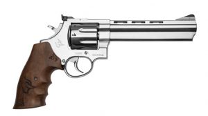 REVÓLVER TAURUS 608 EDIÇÃO ESPECIAL COM CABO DE MADEIRA PERSONALIZADO. Possui capacidade de 8 tiros, calibre .357 Magnum e cano de 6,5" com vértice de mira ajustável e compensador de recuo. Confiável e com alta capacidade de disparos, este modelo é indicado para lazer e defesa pessoal.