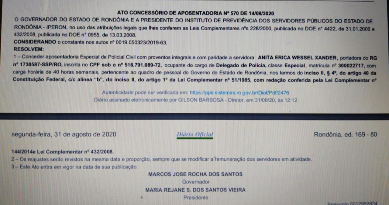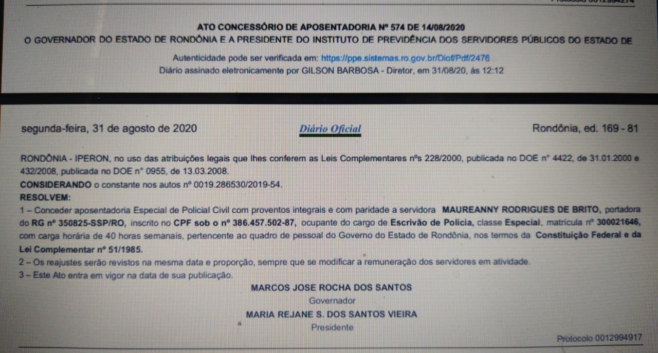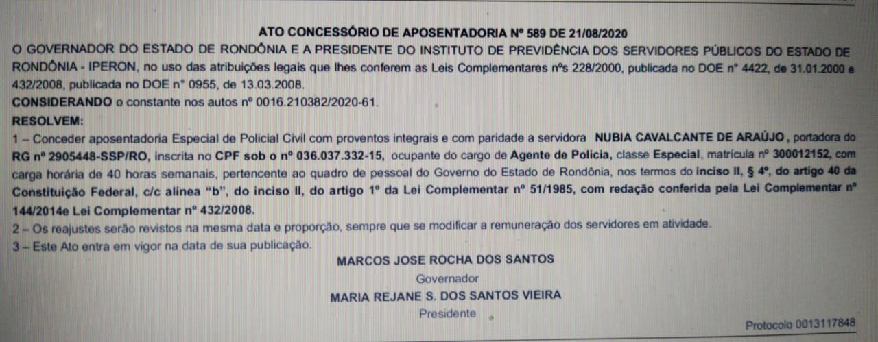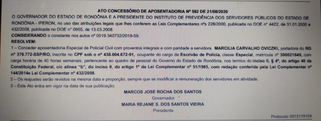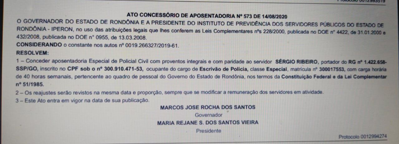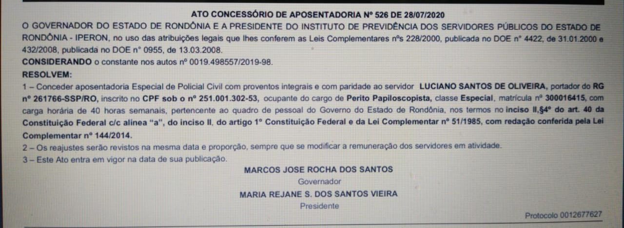 A diretoria do Sindicato dos Servidores da Polícia Civil de Rondônia (SIINPOL-RO), informa a publicação no Diário Oficial do Governo de Rondônia, dos nomes de policiais civis que receberam o benefício da aposentadoria especial com salário integral e com PARIDADE, após relevantes serviços prestados à Segurança Pública e ao Estado de Rondônia.