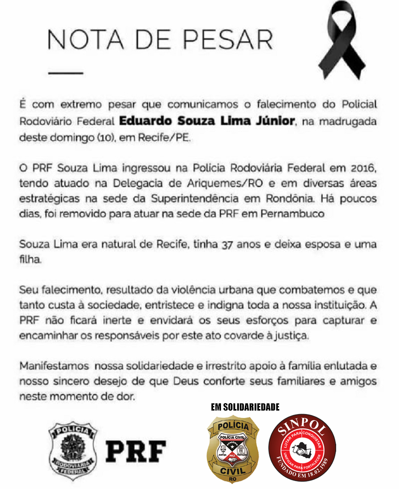 Eduardo de Souza Lima Júnior, que era lotado em Rondônia, foi assassinado a tiros em um posto de combustíveis no bairro Macaxeira, na cidade de Recife, para onde havia sido transferido recentemente. Consta que o policial estaria em um bar com um amigo e teria ocorrido um desentendimento com outros frequentadores do ambiente. Foi então que o PRF e o amigo se dirigiram para uma hamburgueria que fica nas dependências do posto de combustíveis. Após certo tempo, dois criminosos sem capacetes chegaram em uma motocicleta e executaram a vítima com três tiros na cabeça. Os bandidos fugiram sem levar nada. A pistola Glock do policial ficou na cintura dele. As autoridades competentes já estão apurando o crime.
