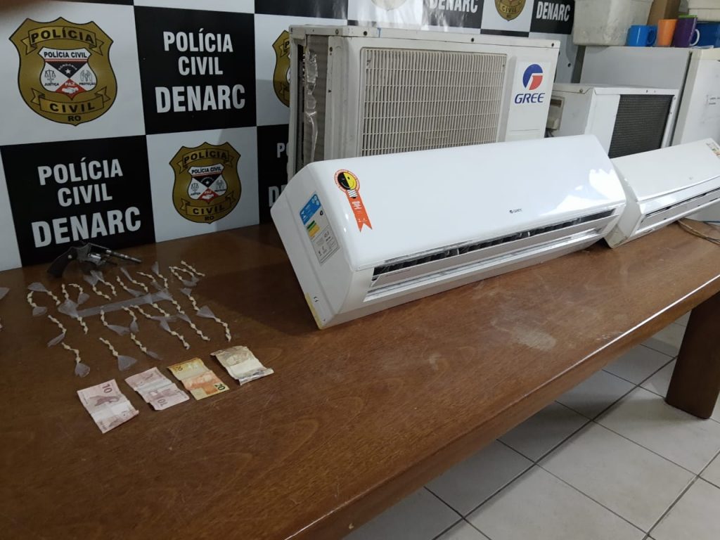 Policiais civis lotados no Departamento de Narcóticos (Denarc) prenderam na tarde desta quinta-feira (14), Helionai P. F., 38, acusado de tráfico de drogas e porte ilegal de arma de fogo. Ele estava em uma boca de fumo na Rua Teodora Lopes, bairro São Francisco, Zona Leste de Porto Velho. De acordo com a ocorrência, os policiais civis do Denarc, após informações de que o acusado estaria vendendo droga na residência, passaram a investigá-lo e em momento oportuno realizaram a abordagem. Segundo os policiais, Helionai foi flagrado com diversas porções de cocaína oxidada, dinheiro, um revólver calibre 22, além de duas centrais de ar condicionado que teriam sido trocadas por entorpecentes. A droga era escondida na geladeira da residência. Ele, segundo a polícia, já tinha passagem por porte ilegal de arma. Perante os fatos, ele ficou preso à disposição da Justiça. Durante a abordagem, foram apreendidas quase 100 porções de cocaína que estavam espalhadas pela casa, dentro do guarda-roupa e até na geladeira. Diante dos fatos, o conduzido foi entregue à autoridade policial, para medidas cabíveis.