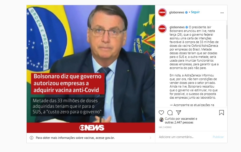 O presidente Jair Bolsonaro anunciou em live, nesta terça (26), que o governo federal assinou uma carta de intenções favorável à compra de 33 milhões de doses da vacina Oxford/AstraZeneca por empresas do Brasil. Metade dessas doses teriam que ser doadas para o SUS e, a outra metade, seria usada para imunizar funcionários dessas empresas, para garantir que a economia do país não pare. Em nota, a AstraZeneca informou que, por ora, não tem condições de vender doses para o setor privado. Ainda na live, Bolsonaro ressaltou que o governo vai estimular, no que for possível, o sucesso da proposta das empresas junto ao laboratório.