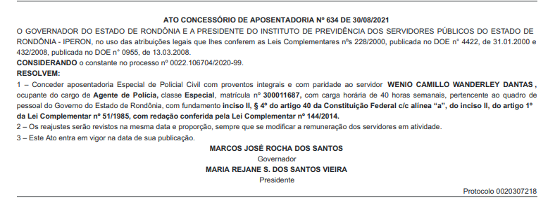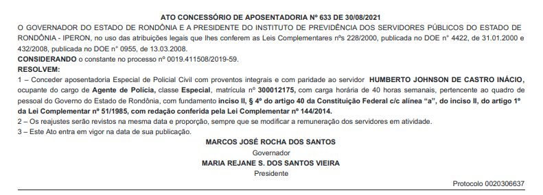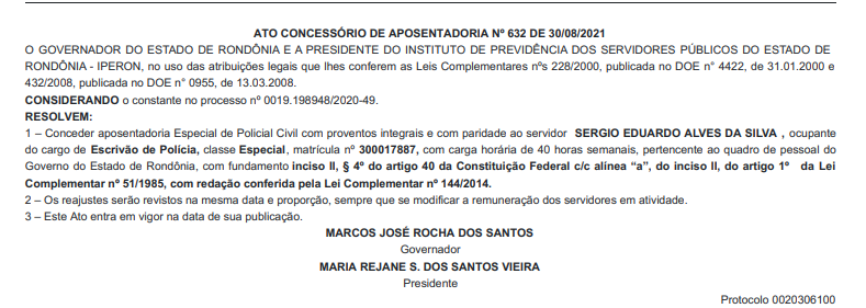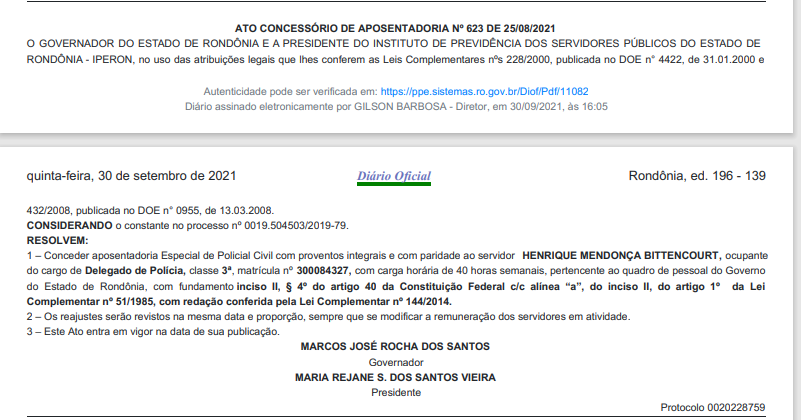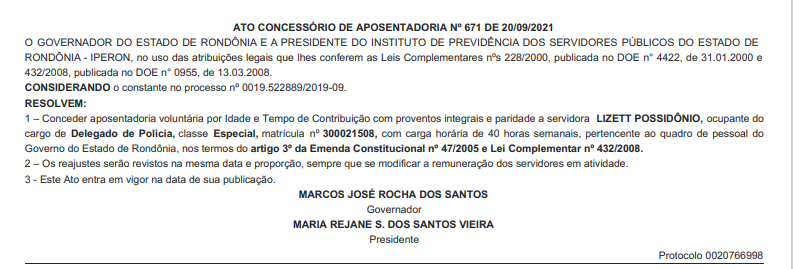 A diretoria do Sindicato dos Servidores da Polícia Civil de Rondônia (SINPOL-RO), informa a publicação no Diário Oficial do Governo de Rondônia, dos nomes de Policiais Civis, que receberam o benefício da aposentadoria especial com salário integral e com PARIDADE, após relevantes serviços prestados à Segurança Pública e ao Estado de Rondônia.