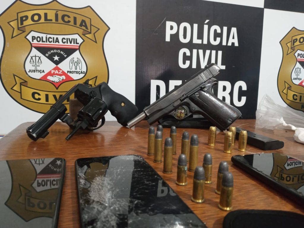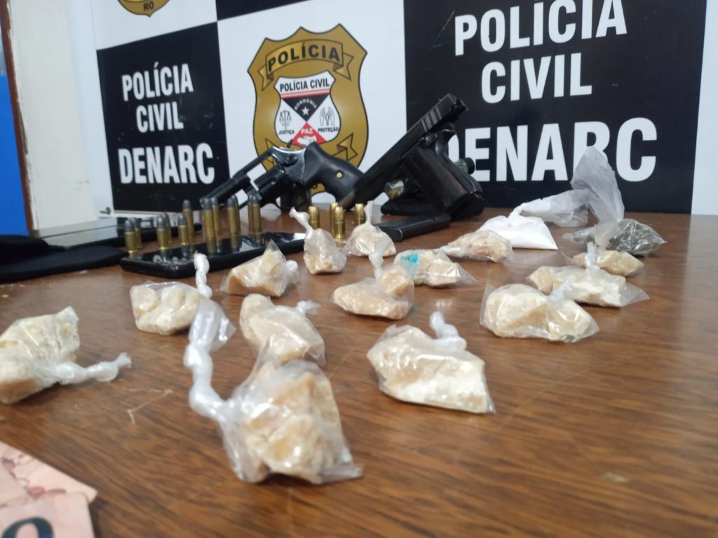 Policiais civis lotados no Departamento de Narcóticos (Denarc) prenderam nesta quinta-feira (21), Samuel de Oliveira, 26 anos, e João Pedro Rodrigues, 24 anos. Eles são acusados de causar terror aos moradores do bairro Aponiã, Zona Norte de Porto Velho. Eles estavam armados, em um automóvel que foi apreendido durante a abordagem. Segundo relato feito por policiais, a dupla andava armada e distribuía drogas no bairro. Os dois foram presos em flagrante. Samuel estava com uma pistola de calibre 45 e João Pedro com um revólver calibre 38. As investigações já tinham identificado o “mocó” onde os dois escondiam droga, nesse local foi encontrado várias porções grande de cocaína oxidada, a "pedra", além de muito dinheiro trocado. De acordo com o registro policial, Samuel já possui várias passagens pelo sistema penal, por tráfico de drogas, roubo e porte ilegal de arma. João Pedro também tem passagem pelo crime de roubo. Segundo a polícia, João Pedro e Samuel são acusados, também, de recrutarem um jovem para fazer a guarda da droga. Ele foi identificado como Alex Cardoso de Brito, de 25 anos. Alex não tinha passagem pelo sistema pena. Todos foram presos na Rua Eletronorte, nas proximidades do linhão. Está é a terceira vez nos últimos cinco meses que o Denarc realiza operação nessa localidade, prendendo traficantes que atuam no local.