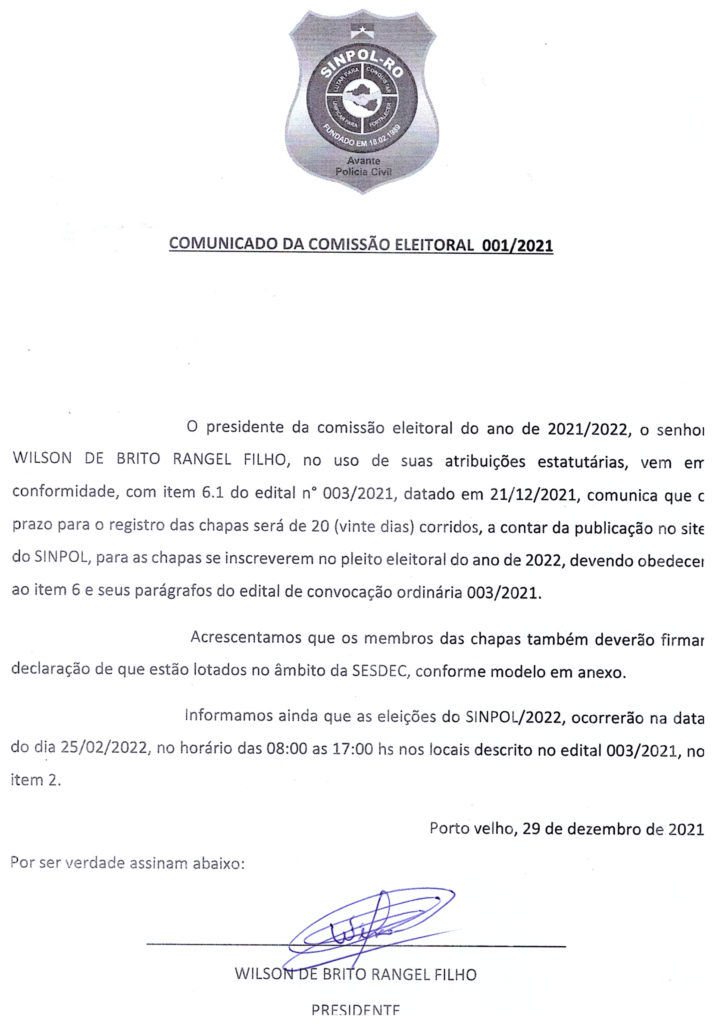 Presidente da Comissão Eleitoral divulga comunicado abrindo prazo para inscrição das chapas para concorrerem às eleições da nova diretoria do Sinpol-RO para o quadriênio 2022 a 2026
