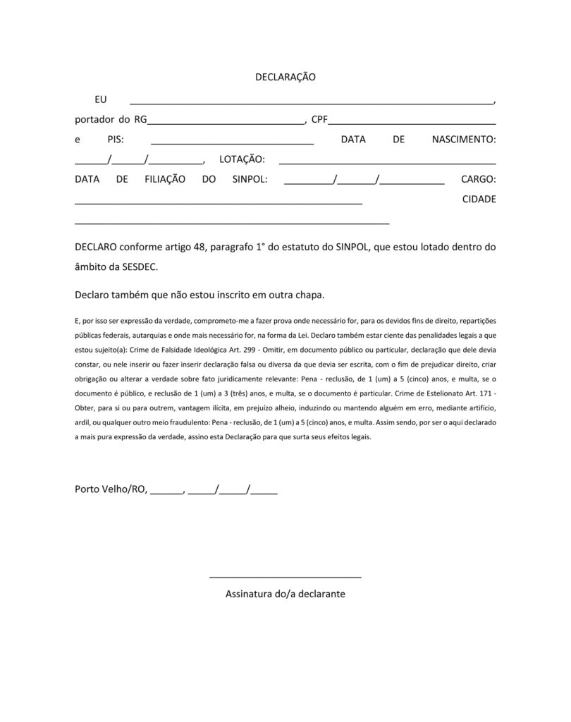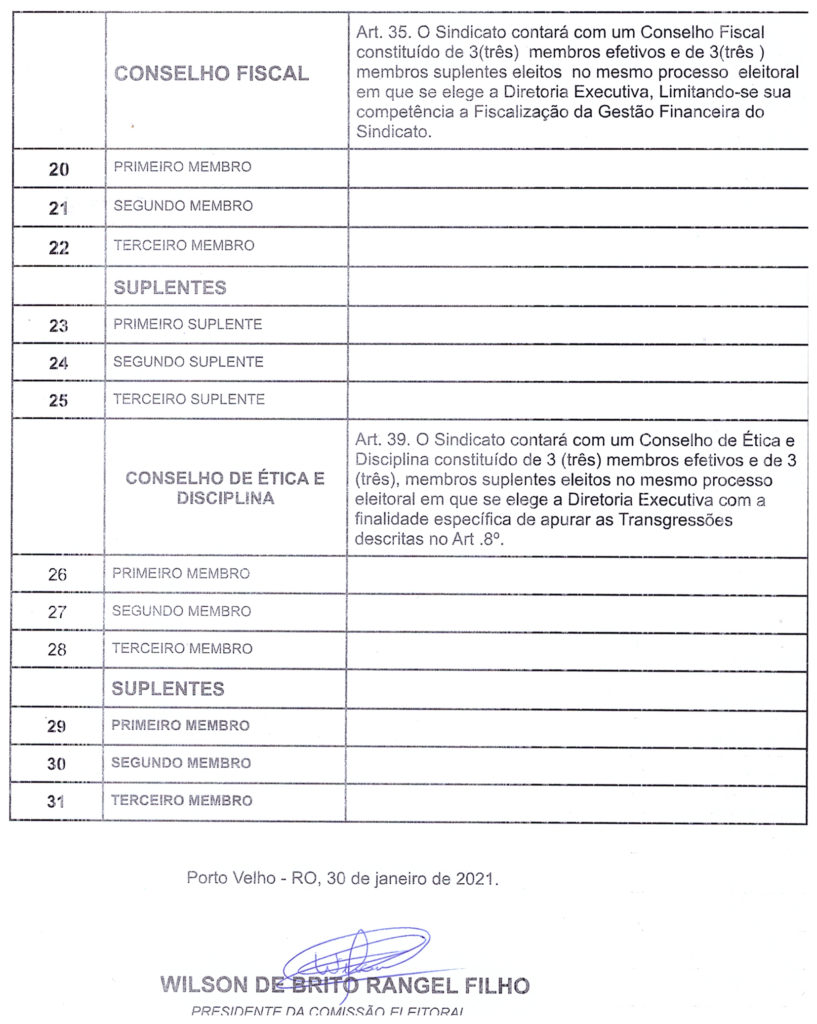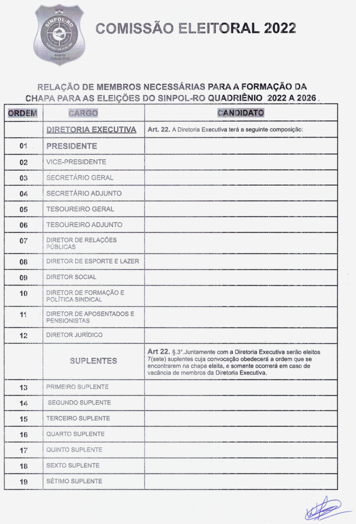 A comissão eleitoral devidamente empossada comunica aos interessados que se encontra aberto o prazo para a inscrição das chapas que desejarem concorrer a Presidência do SINPOL-RO acompanhada dos membros que comporão a diretoria executiva, Conselho Fiscal e Conselho de Ética e Disciplina, o presidente informa que houve algumas alterações em relação ao pleito passado, devendo os interessados ler atentamente o Estatuto e o Edital a fim de cumprir prazos e exigências, qualquer informação adicional os Interessados podem se dirigir ao Sindicato para conversar com o presidente da Comissão Eleitoral e dirimir as dúvidas. Obs: segue anexo a esta publicação a relação de exigências e formulários que deverão ser apresentados para inscrição da chapa.