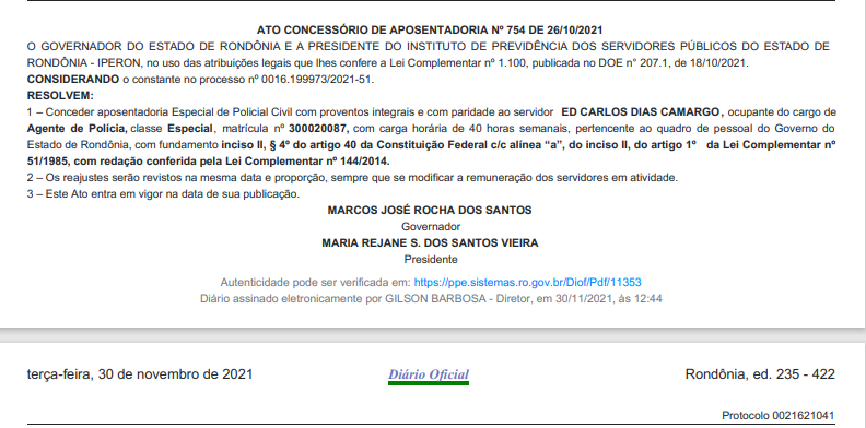 Confira as imagens da publicação realizada no Diário Oficial do Estado, em 30 de NOVEMBRO DE 2021, com os nomes dos policiais civis contemplados, abaixo: