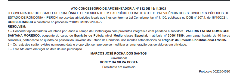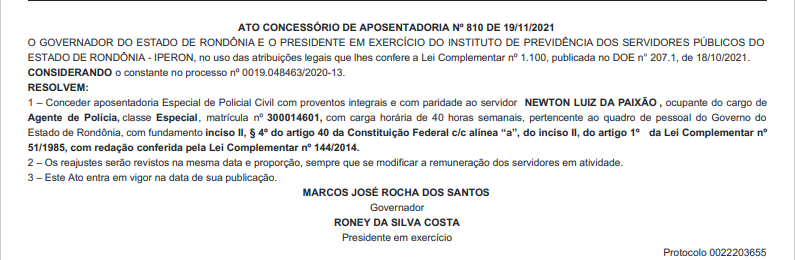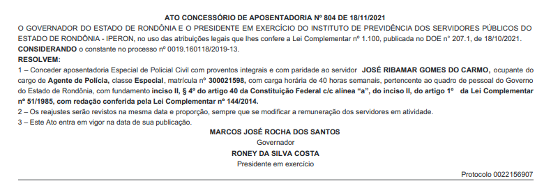 A diretoria do Sindicato dos Servidores da Polícia Civil de Rondônia (SINPOL-RO), informa a publicação no Diário Oficial do Governo de Rondônia, dos nomes de Policiais Civis, que receberam o benefício da aposentadoria especial com salário integral e com PARIDADE, após relevantes serviços prestados à Segurança Pública e ao Estado de Rondônia.