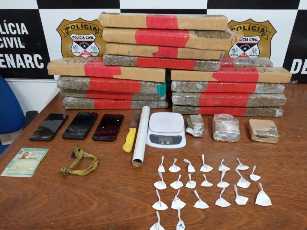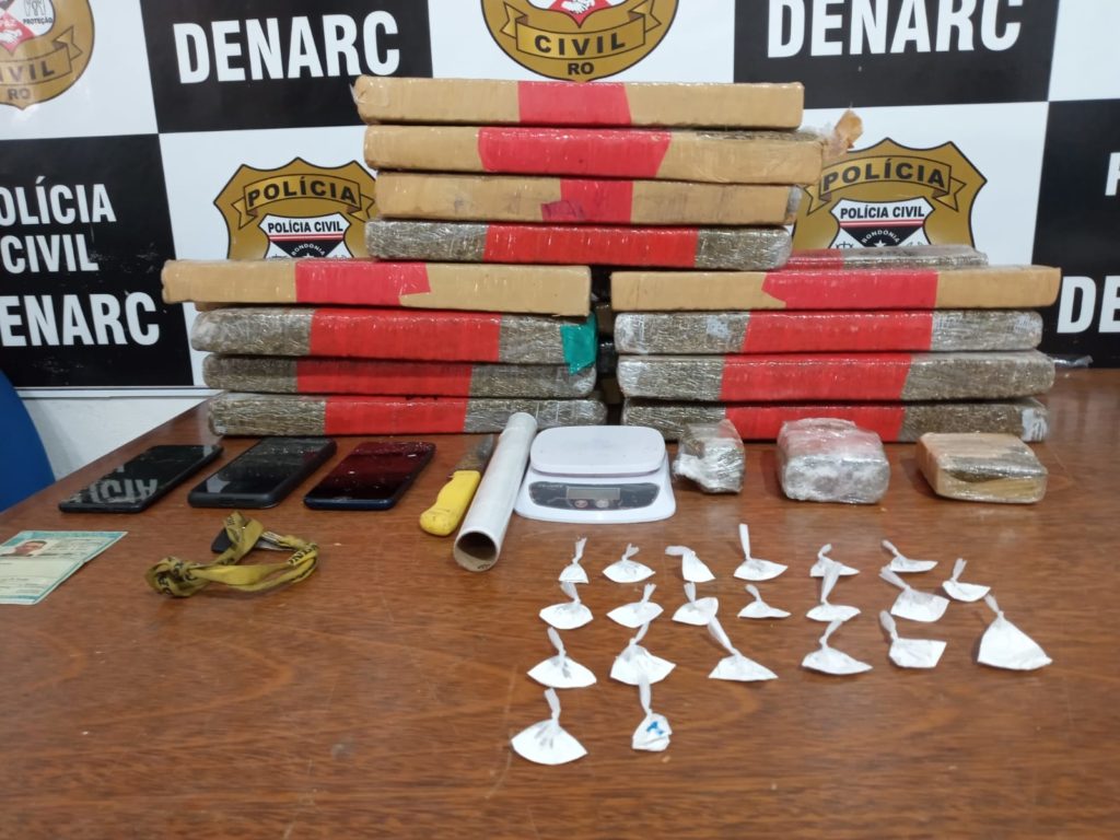 Policiais civis lotados no Departamento de Narcóticos (Denarc) prenderam na tarde de sábado (04), Fábio Gomes da Silva, 37 anos, acusado de tráfico de drogas. De acordo com relatos feitos pelos agentes, Fábio tinha sob seu poder quase quilos de 25 quilos de drogas entre maconha e cocaína. A prisão ocorreu à Rua Matrizeira, bairro Nacional, na Zona Norte, área portuária de Porto Velho. Segundo a polícia, o suspeito há havia sido preso outras três vezes, acusado do mesmo crime, relata a ocorrência policial. Anda de acordo com a ocorrência, em 2018, ele teria sido preso com mais de 10 quilos de cocaína. A prisão, à época, aconteceu também em Porto Velho. De acordo com o Denarc, em 2018, Fábio teria saído da cadeia em liberdade assistida. Ele votou à prática do mesmo crime, a comercialização de drogas. A polícia afirma que ele se transformou o maior distribuidor que abastecia as bocas de fumo de fumo do bairro Nacional. As investigações apontaram, de novo, Fábio como líder do tráfico na região. A casa em que ele mora foi identificada como local de tráfico e armazenagem da droga. Uma pessoa identificada como “Pedro” foi apontada pela polícia como sócio de Fábio no comércio da droga. Eles seriam vizinhos, diz a investigação do Denarc. No sábado, em posse de mando de busca e apreensão, homens do Denarc à casa de Fábio e fizeram a abordagem. A operação resultou na apreensão de aproximadamente de 25 quilos de maconha e pequenas porções de cocaína. Foram apreendidos ainda objetos usados para pesar, separar e empacotar a droga. De acordo com a ocorrência policial feita pelo Denarc, buscas foram feitas na casa do sócio de Fábio, identificado como “Pedro”, que não estava no local. Fábio foi conduzido ao Denarc e ficará à disposição da Justiça.