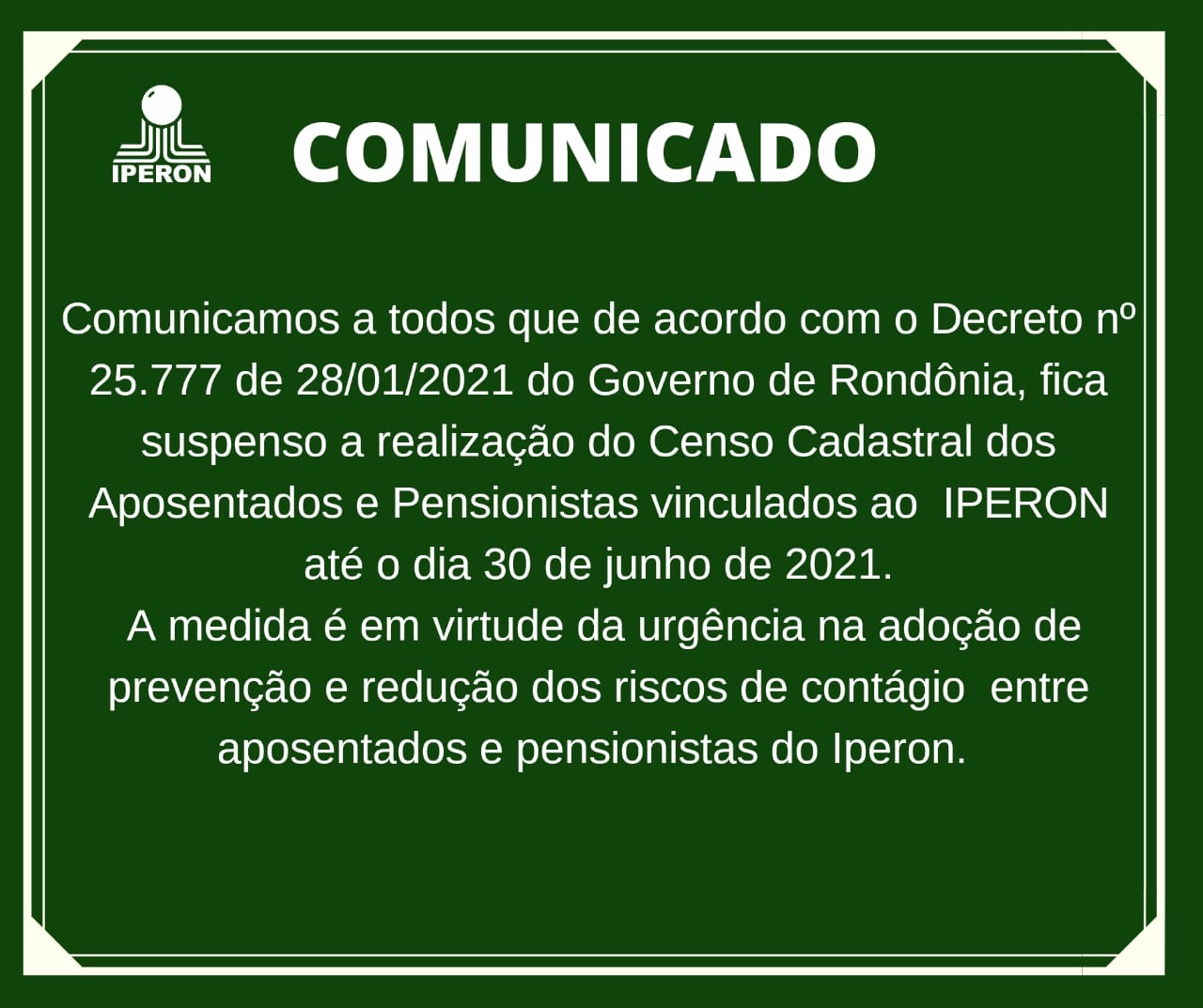 A diretoria do Sindicato dos Servidores da Polícia Civil do Estado de Rondônia (SINPOL-RO), informa para todos os aposentados e pensionistas que o Censo Cadastral dos Aposentados e Pensionistas vinculados ao Instituto de Previdência de Rondônia (IPERON), foi prorrogado até o dia 30 de junho de 2021. A medida é em virtude da urgência na adoção de prevenção e redução dos riscos de contágio entre aposentados e pensionistas do IPERON.