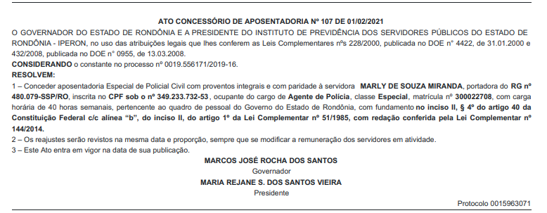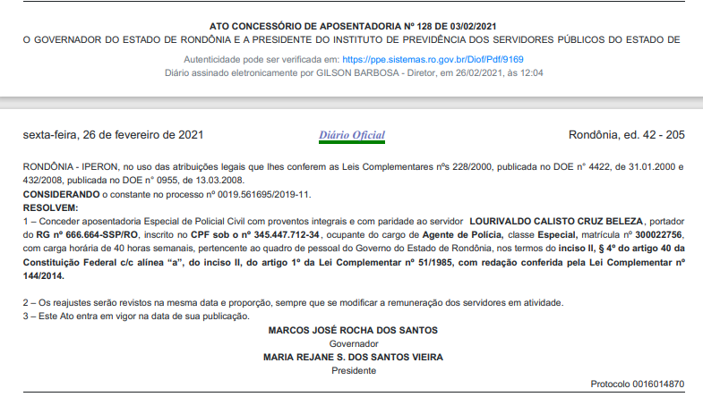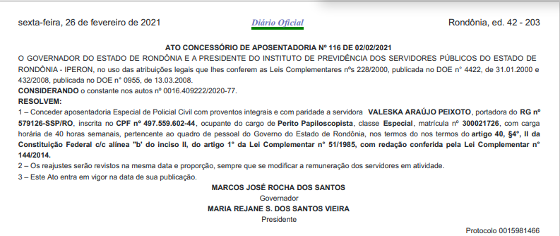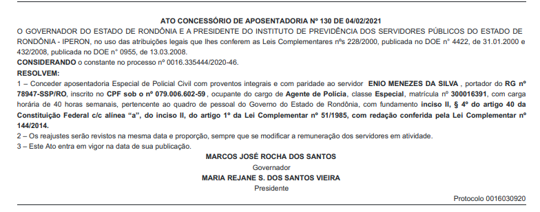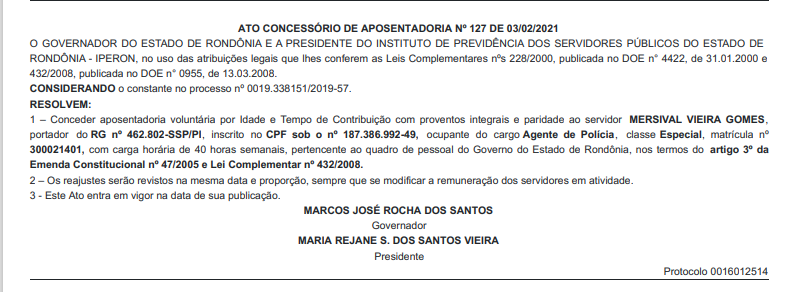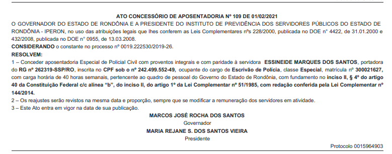 A diretoria do Sindicato dos Servidores da Polícia Civil de Rondônia (SINPOL-RO), informa a publicação no Diário Oficial do Governo de Rondônia, dos nomes de policiais civis que receberam o benefício da aposentadoria especial com salário integral e com PARIDADE, após relevantes serviços prestados à Segurança Pública e ao Estado de Rondônia.
