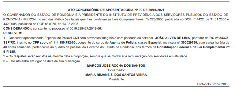 De acordo com a diretoria, a publicação é o resultado de um trabalho árduo realizado pelo SINPOL para que o Estado garanta ao policial sua aposentadoria ESPECIAL COM TODOS OS DIREITOS E VANTAGENS DO CARGO, relata o presidente Rodrigo Marinho. Ele explica que havia cerca de 300 processos de aposentadorias em andamento, e que o sindicato mantém uma rotina de trabalho esfera administrativa e política para que haja mais celeridade e redução do tempo de espera.