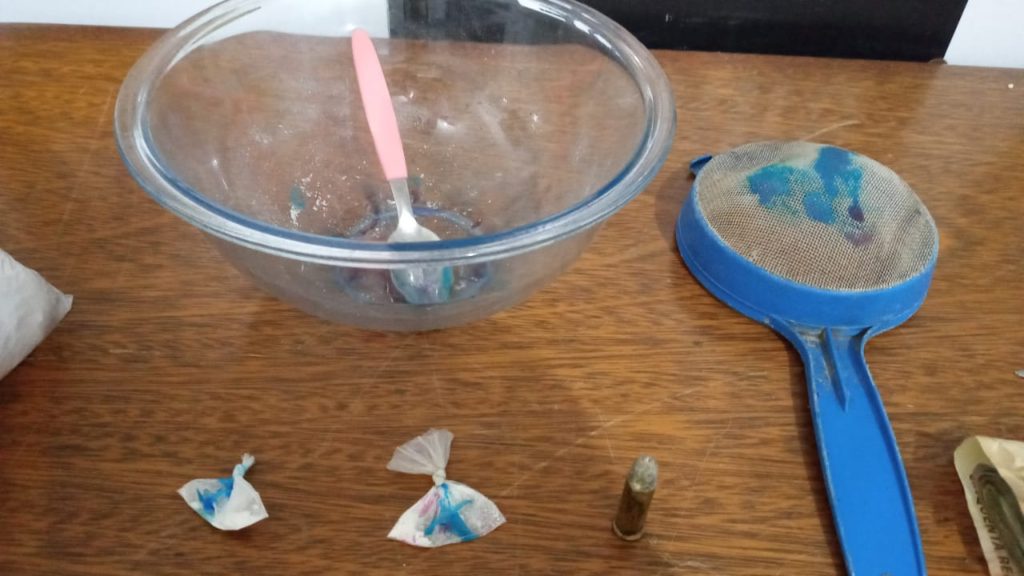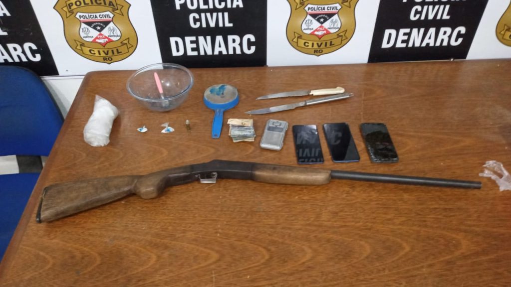 Policiais civis lotados no Departamento de Narcóticos (Denarc), após briga de traficantes por comando de bocas de fumo, cumpriu, no início da noite desta segunda-feira (17), mandado de busca e apreensão, em Porto Velho. Durante a ação, foi apreendida uma espingarda calibre 12, munição de calibre 38 e apetrechos com resquícios de cocaína. No local ainda foi encontrado duas porções de cocaína e uma munição de revolver 38. Segundo o relato feito pelos policiais, ao chegar ao Denarc, foram informando que no bairro Porto Cristo, Zona Leste de Porto Velho, estava ocorrendo uma disputa por pontos de venda de drogas. O Denarc investigou e identificou uma mulher identificada apenas por “Cátia” e seu filho, Tiago, como quem queria assumir o tráfico no local. Durante a abordagem, Tiago não estava no local, por isso não foi preso, apenas sua mãe Cátia.