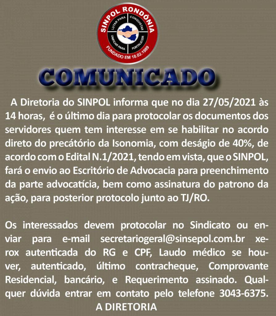 EDITAL DE CONVOCAÇÃO n.° 001/2026/DJ/SINPOL-RO