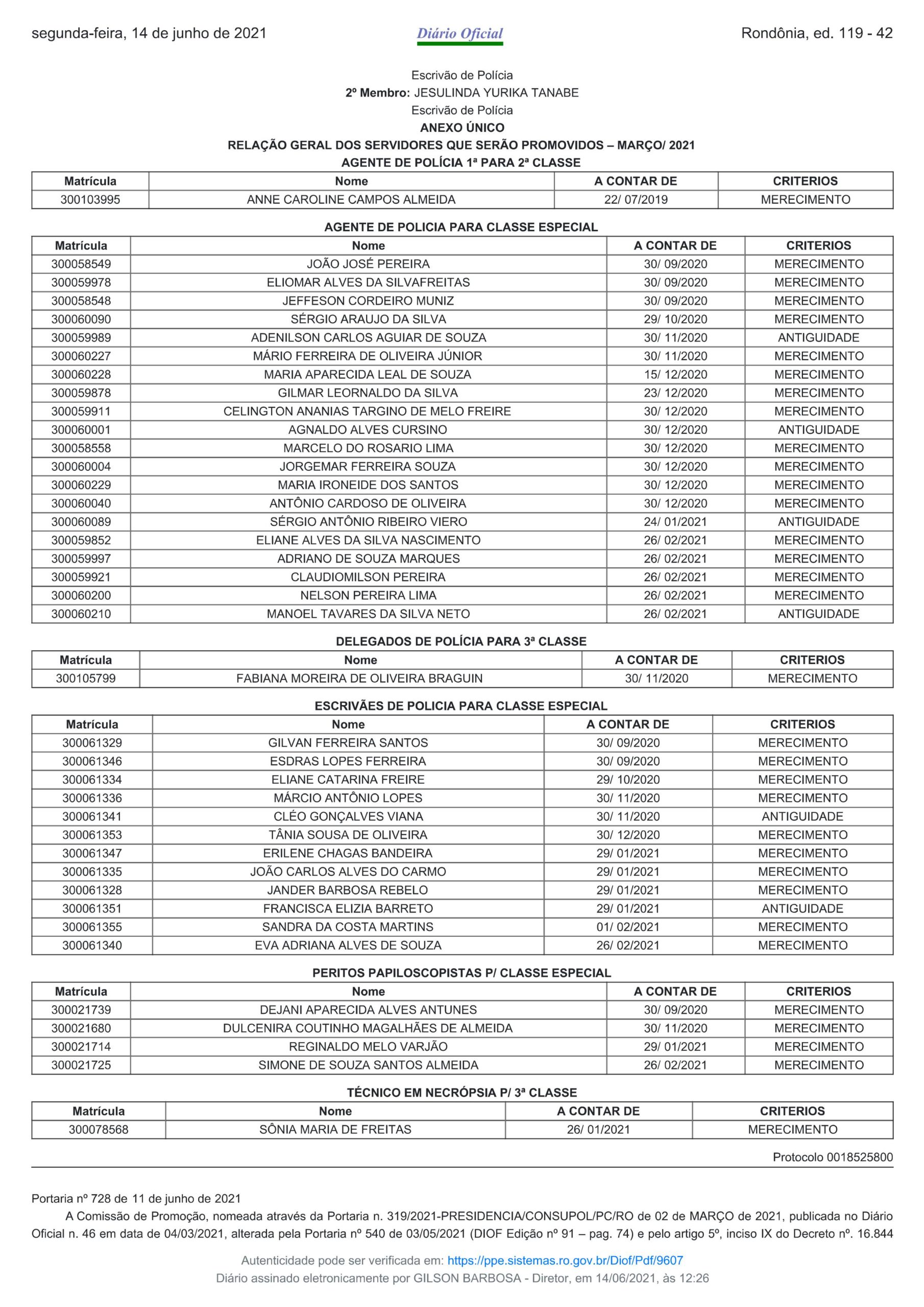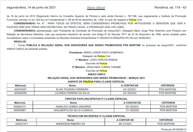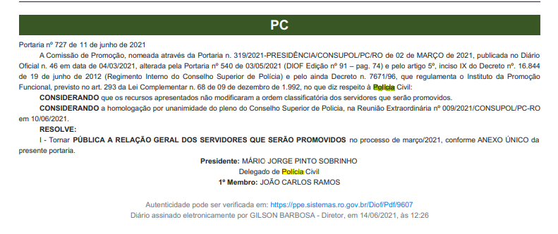 A diretoria do SINPOL-RO torna público aos filiados interessados, a RELAÇÃO GERAL DOS SERVIDORES QUE SERÃO PROMOVIDOS no processo de MARÇO DE 2021.