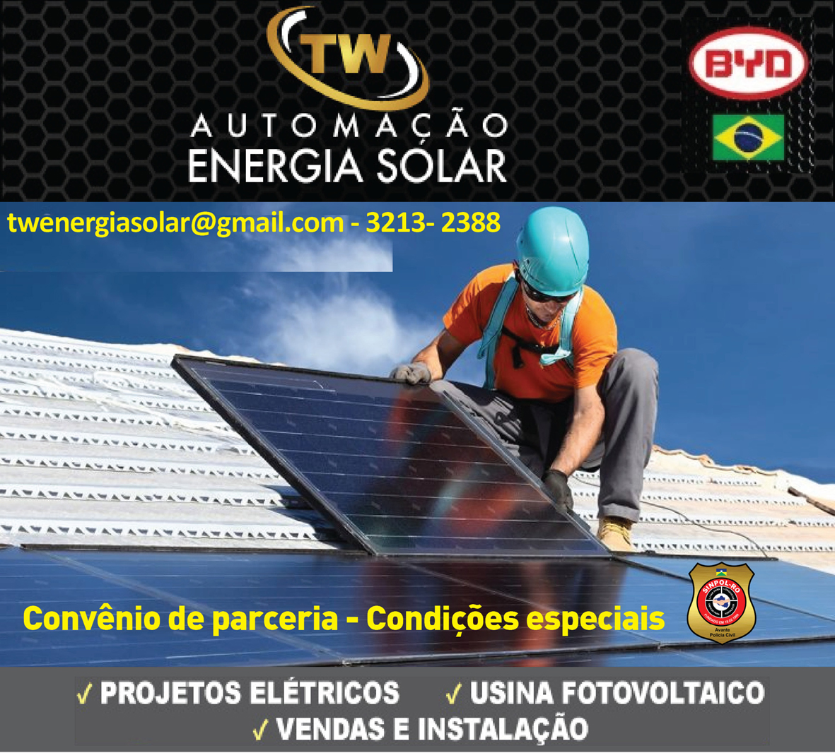 SINPOL celebra Convênio TW ENERGIA SOLAR. A Diretoria do Sindicato dos Servidores da Polícia Civil do Estado de Rondônia– SINPOL informa para todos os seus filiados/dependentes/colaboradores da celebração de Convênio com TW ENERGIA SOLAR, situado na rua Guanabara, nº1265, Nossa Senhora das Graças, Porto Velho – RO, Fone: (69) 992265-7778.| SERVIÇO | VALOR CONVENIADO |