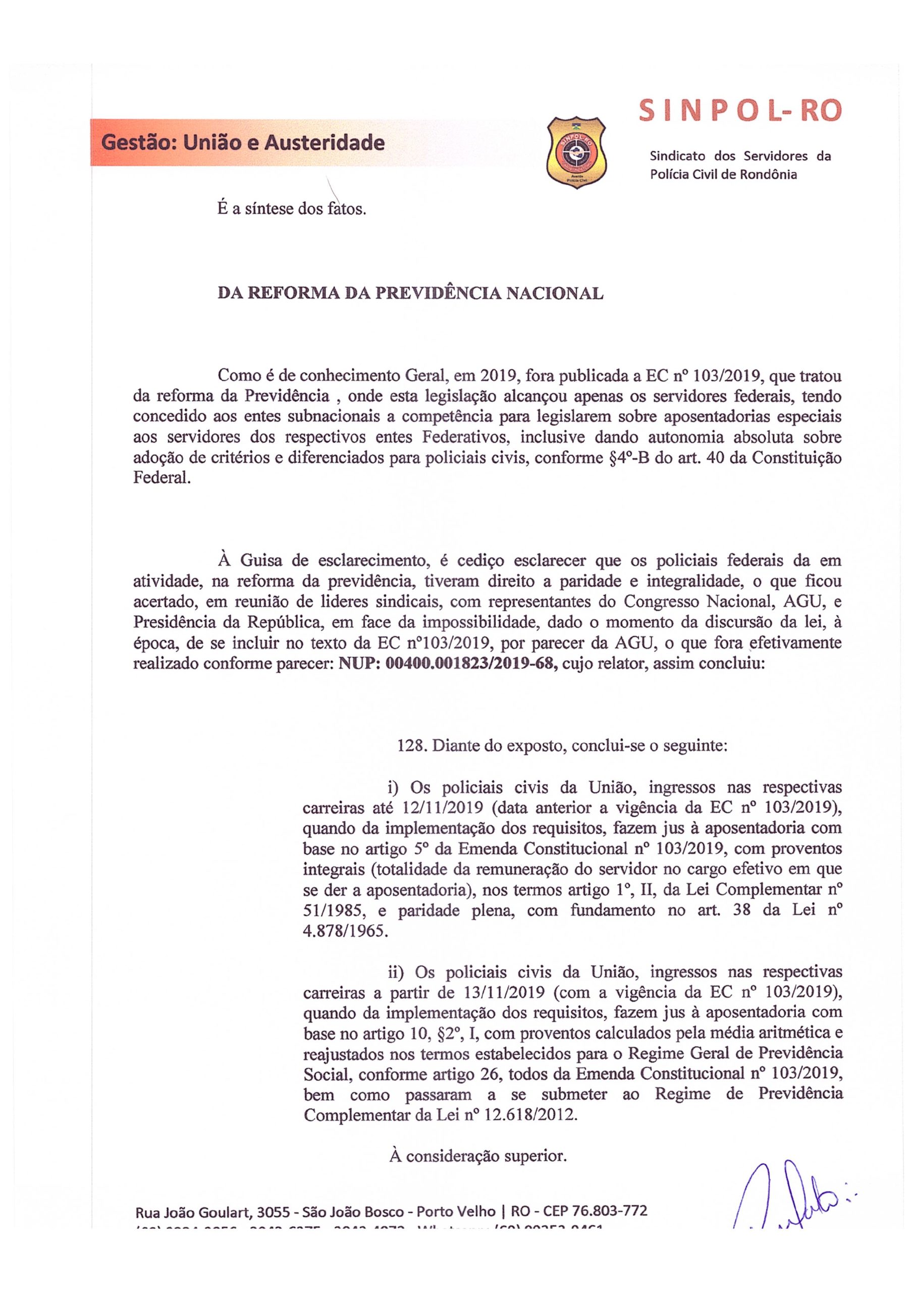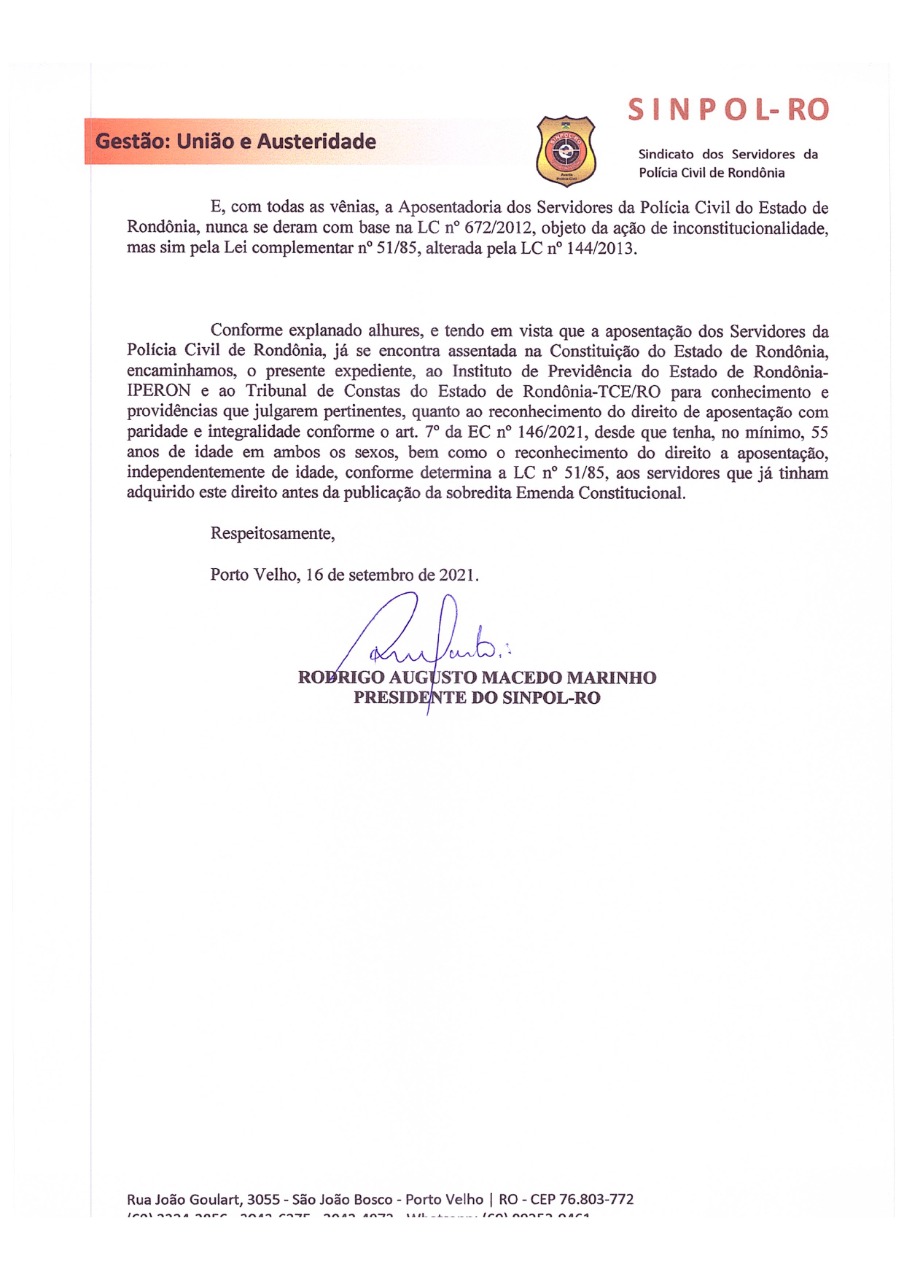 Diante os fatos, a Diretoria encaminhou expediente ao IPERON E TCE-RO, explicando todo o histórico de direitos de aposentadoria dos servidores da polícia civil do Estado de Rondônia.