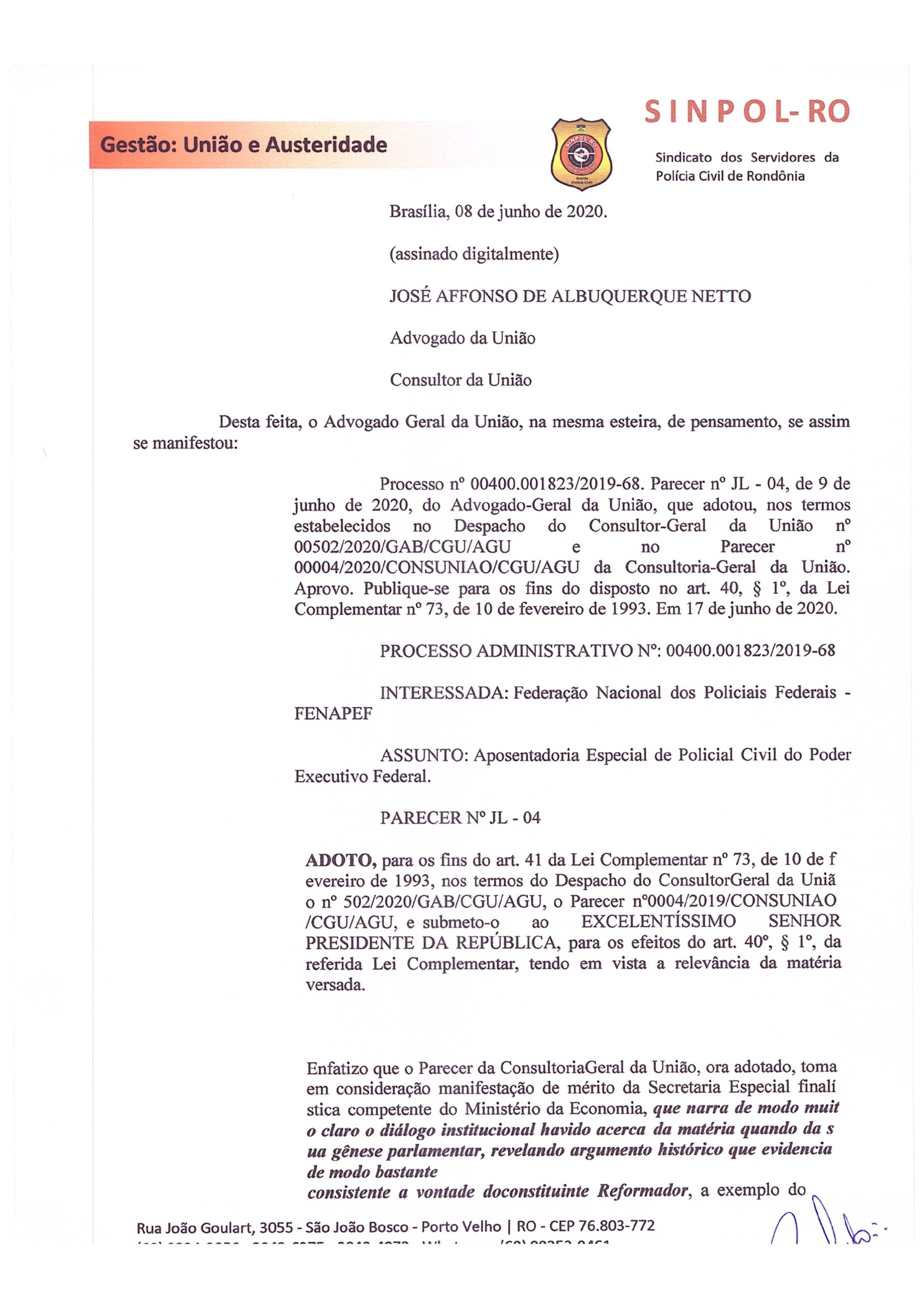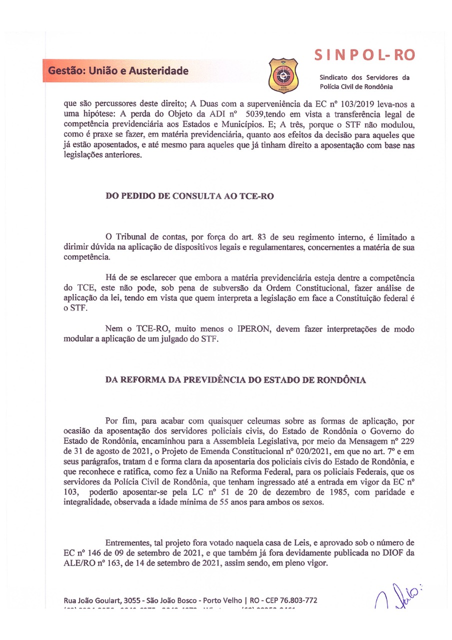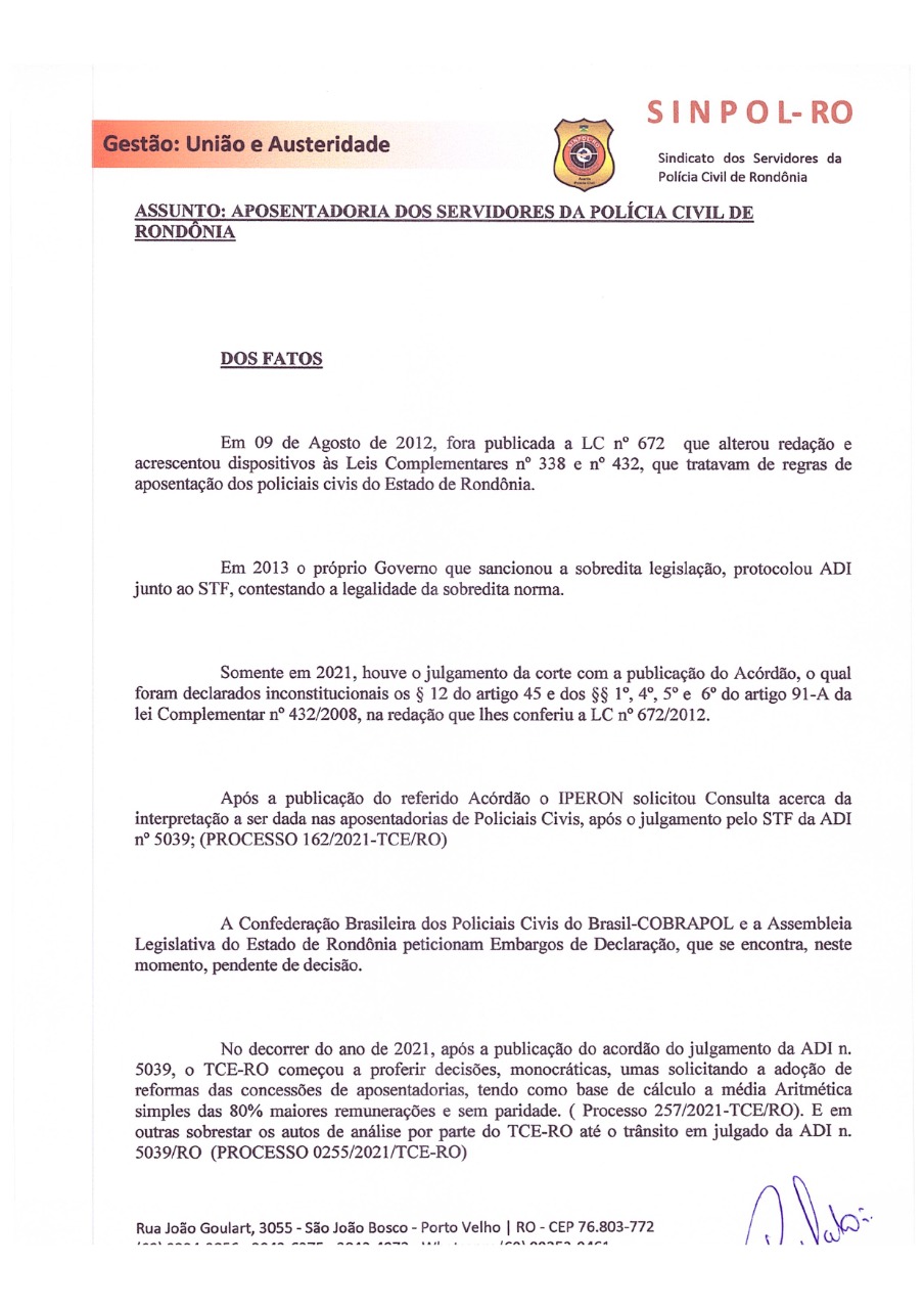 A diretoria após tomar conhecimento de que o IPERON, após julgamento da ADI 5039, que julgou inconstitucional a Lei Complementar Estadual nº 672, fez consulta ao TCE-RO, para saber como se daria, doravante, as aposentadorias dos policiais civis de Rondônia, e que por sua vez, o TCE-RO em alguns procedimentos recomendou o refazimento do cálculo de aposentadoria de alguns servidores, pela regra geral, e em outros o sobrestamento da homologação dos processos de aposentadorias dos policiais civis, até o trânsito em julgado da sobredita ADI 5039, tratou de fazer a defesa das aposentadorias especiais junto aos respectivos órgãos.