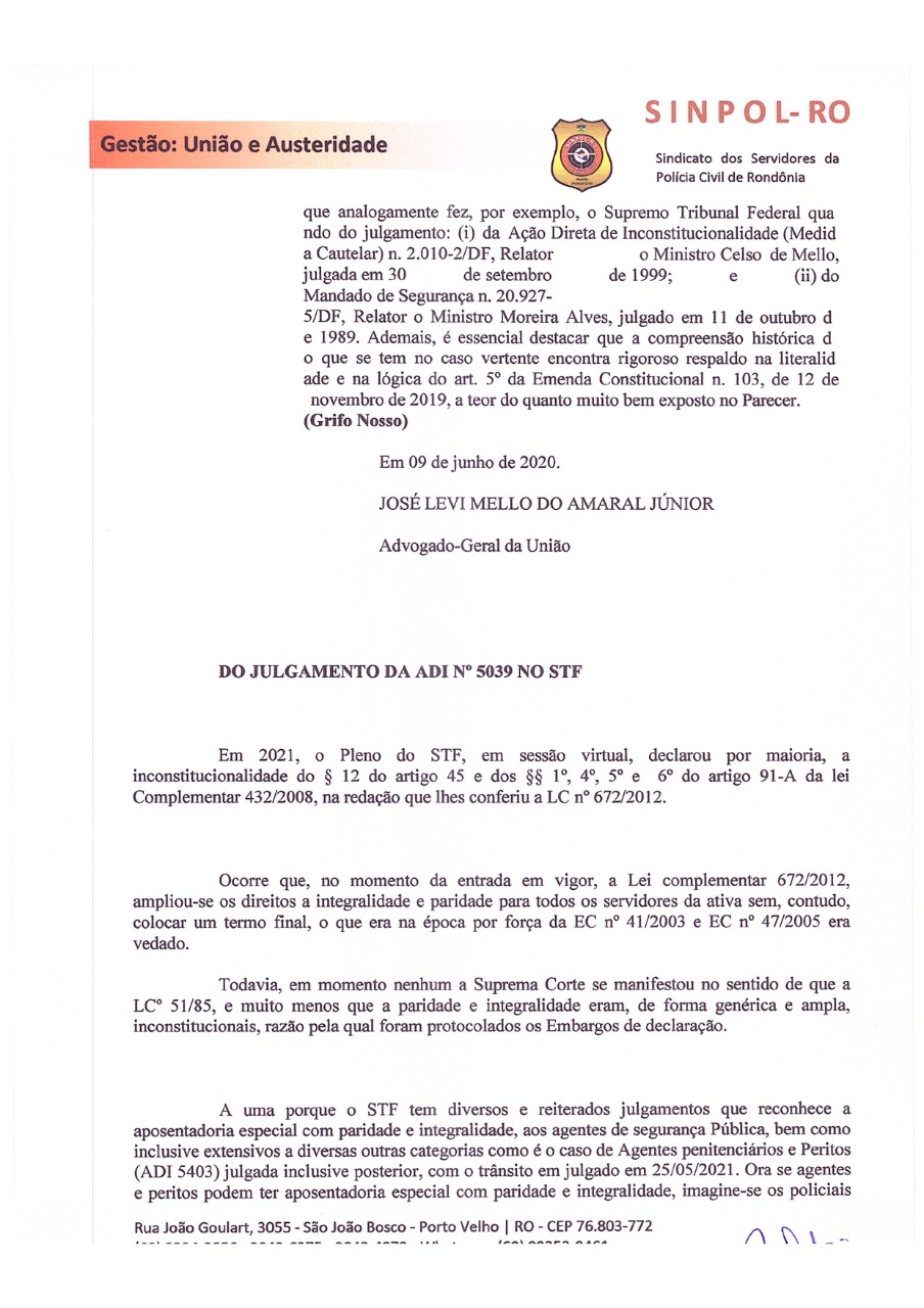 “Acabou a celeuma, agora entendemos que a ADI 5039, perdeu o objeto, tendo em vista que o Estado de Rondônia, por meio de Reforma Previdenciária, assentou na Constituição Estadual os regramentos de aposentação do Policial Civil, deixando claro que será de acordo com a Lei complementar nº 051/85, com paridade e integralidade para todos que estão em atividade até a data da publicação da Emenda nº 146 de 14 de setembro de 2021.” Disse Rodrigo Marinho, Presidente do SINPOL-RO.