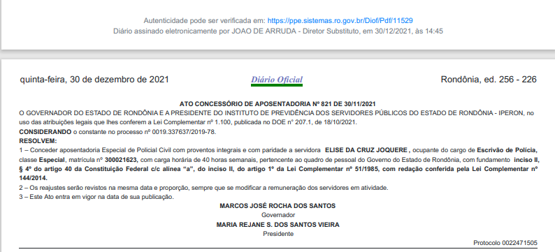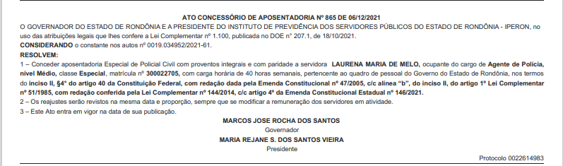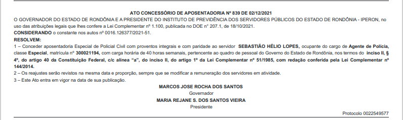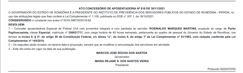 A diretoria do Sindicato dos Servidores da Polícia Civil de Rondônia (SINPOL-RO), informa a publicação no Diário Oficial do Governo de Rondônia, dos nomes de Policiais Civis, que receberam o benefício da aposentadoria especial com salário integral e com PARIDADE, após relevantes serviços prestados à Segurança Pública e ao Estado de Rondônia. De acordo com a Diretoria, a publicação é o resultado de um trabalho árduo realizado pelo SINPOL, para que o Estado garanta ao policial sua aposentadoria ESPECIAL COM TODOS OS DIREITOS E VANTAGENS DO CARGO. O presidente Rodrigo Marinho, explica que havia cerca de 300 processos de aposentadoria em andamento, e que o sindicato mantém uma rotina de trabalho na esfera administrativa e política para que haja mais celeridade e redução no tempo de espera. Há ainda um trabalho de articulação política para que o projeto de Lei que tramita na Assembleia Legislativa de Rondônia, o qual determina o prazo de 90 dias para a conclusão do processo de aposentadoria, que quando DEFERIDO, seja CUMPRIDO pelo Governo de Rondônia. O presidente classifica como inconcebível o fato de o governo, atualmente, demorar anos para fazer a análise de um pedido de aposentadoria. Para que haja celeridade nos processos em andamento, o SINPOL realiza, diariamente, visitas aos órgãos competentes do governo, bem como ao Instituto de Previdência de Rondônia (IPERON), além do acompanhamento direto, caso a caso, para que o tempo de tramitação seja reduzido ao máximo, relata o diretor-financeiro, José Ribeiro. Confira as imagens da publicação realizada no Diário Oficial do Estado, em 30 de DEZEMBRO DE 2021, com os nomes dos policiais civis contemplados, abaixo: