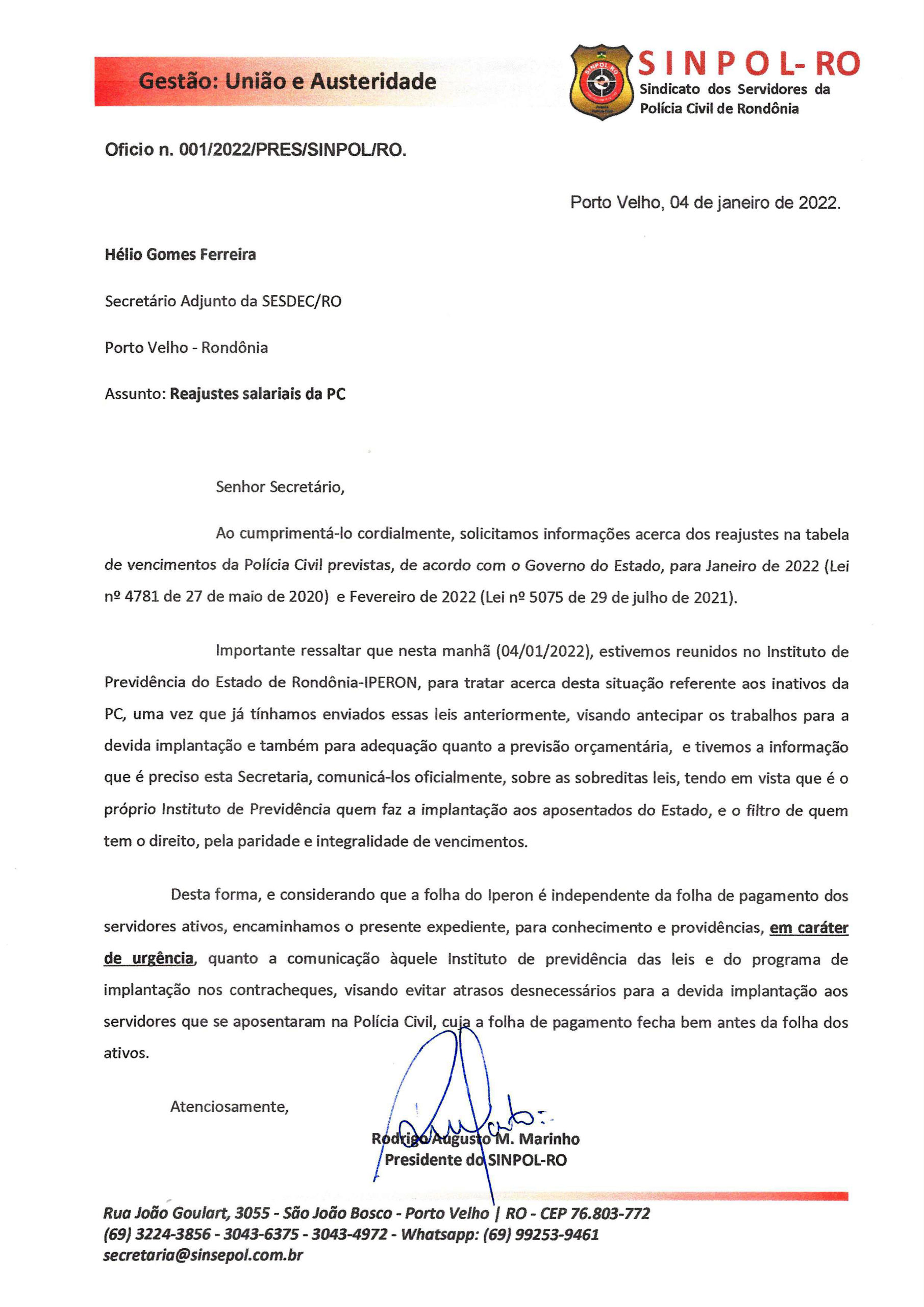 A diretoria do Sindicato dos Servidores da Polícia Civil (SINPOL-RO) confirmou nesta quarta-feira, 05 de janeiro, o pagamento da parcela do realinhamento para janeiro e fevereiro deste ano. A direção informa ainda que o pagamento incluiu servidores ativos e inativos. O anúncio foi feito durante reunião nesta quarta-feira (05), no Iperon, com a Diretora de Previdência, Universa Lagos e do secretário-adjunto da Sesdec, Hélio Ferreira Gomes. A reunião contou ainda com a presença do advogado Hélio Vieira. A diretoria do SINPOL-RO agradece o compromisso com a Polícia Civil do governador Marcos Rocha, do secretário de Segurança, Defesa e Cidadania, Hélio Pacha, bem como do secretário-adjunto, Hélio Ferreira Gomes.