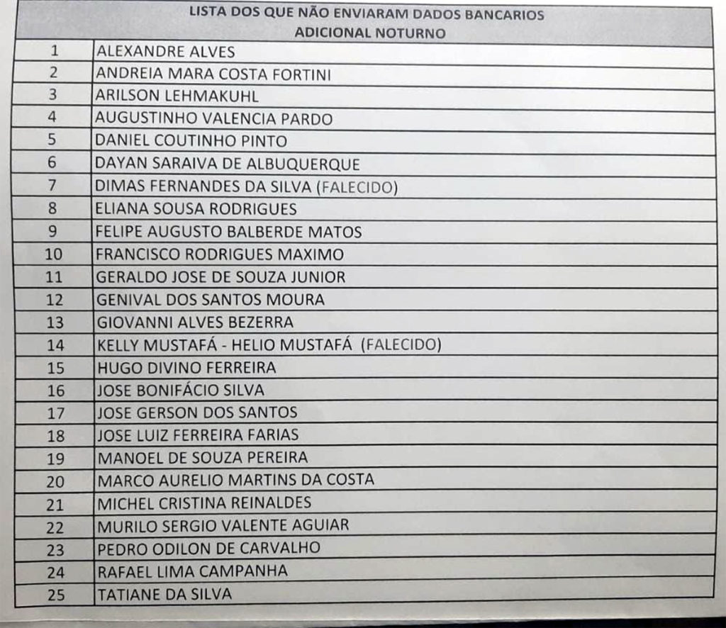 Conforme matéria publicada no site do SINPOL em 28 de janeiro de 2021, informando sobre a necessidade de repassar os dados bancários para a emissão do RPV do Adicional noturno, informamos que alguns nomes não encontramos os dados bancários em nosso banco de dados. Estamos solicitando que as pessoas abaixo enviem com a maior brevidade, os dados de suas contas agencia e banco para que o RPV seja emitido confira se seu nome consta na lista abaixo.