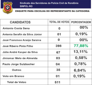 Aconteceu na data de hoje uma grande movimentação entres os filiados do SINPOL-RO, no Estado de Rondônia, onde foi realizado na capital, Porto Velho uma ENQUETE para que a categoria escolhesse um nome para representar a mesma a uma vaga de pré-candidatura a Deputado Estadual na casa de Leis de Rondônia. No interior as regionais se mobilizaram colocando urnas para que os servidores pudessem manifestar a sua vontade na escolha do nome que vai representá-los. Foi convidado para ministrar uma palestra sobre Empoderamento Político, o Policial Civil do Acre Itamir Lima , ex-presidente da Federação dos Policiais da Região Norte e ex-presidente do SINPOL-AC, onde o mesmo discorreu a respeito da responsabilidade do Policial Civil, no pleito democrático, demonstrando vários cenários onde o não envolvimento com a política trouxe grandes prejuízos a categoria, bem como onde houve o envolvimento as conquistas que refletem em grandes melhorias salariais. Na capital Porto Velho, o SINPOL-RO, realizou uma ENQUETE onde houve uma grande movimentação de filiados onde mais de 150 filiados participaram e votaram para a escolha do nome que irá trabalhar para conseguir os votos necessários para que possa conquistar uma vaga como Deputado Estadual. Trata-se de um momento ímpar na história do Sindicalismo da Polícia Civil, pois em mais de 32 anos da fundação do mesmo, nenhuma diretoria viabilizou uma plataforma de envolvimento político para a categoria, em uma atitude de coragem da atual diretoria que entendeu que sem o envolvimento com a Política Partidária não será possível atingir os objetivos pleiteados pela categoria. Agradecendo a grande participação dos filiados, que entre capital e interior, mais de 500 filiados votaram na enquete, demonstrando a preocupação com o momento político que se aproxima, entenderam que esse é o meio mais eficaz para o fortalecimento da categoria. Após a realização da enquete a categoria escolheu com ampla maioria com 77,8% dos Votos o Atual Presidente José Ribeiro que agradeceu a o reconhecimento do seu trabalho e se coloca a disposição de todos para esta grandiosa missão de representar a categoria.
