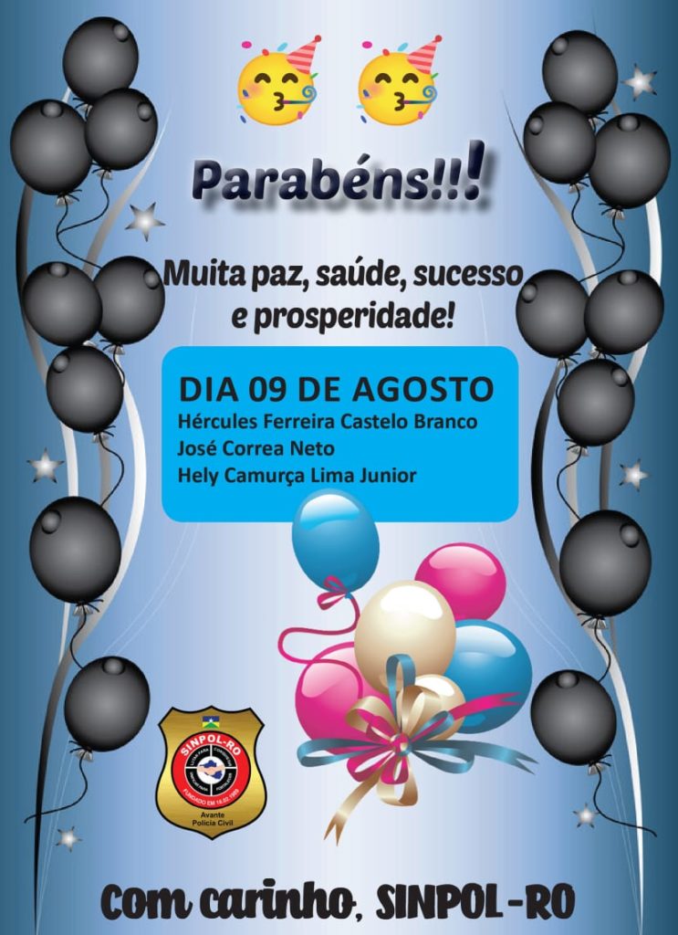A Diretoria do SINPOL-RO, parabeniza os filiados que completaram aniversário no dia 09 de Agosto, desejamos  a todos muito sucesso, saúde e paz.